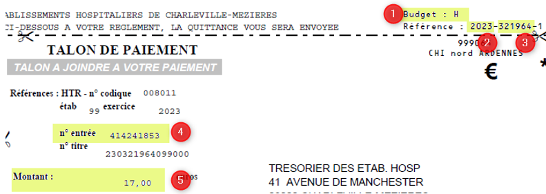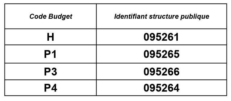Pour retrouver l’identifiant structure publique, il faut se reporter sur votre avis de somme à payer et sur le tableau suivant, le code budget est présent en bas à droite de la facture. (voir image suivante, numéro 1 en rouge).